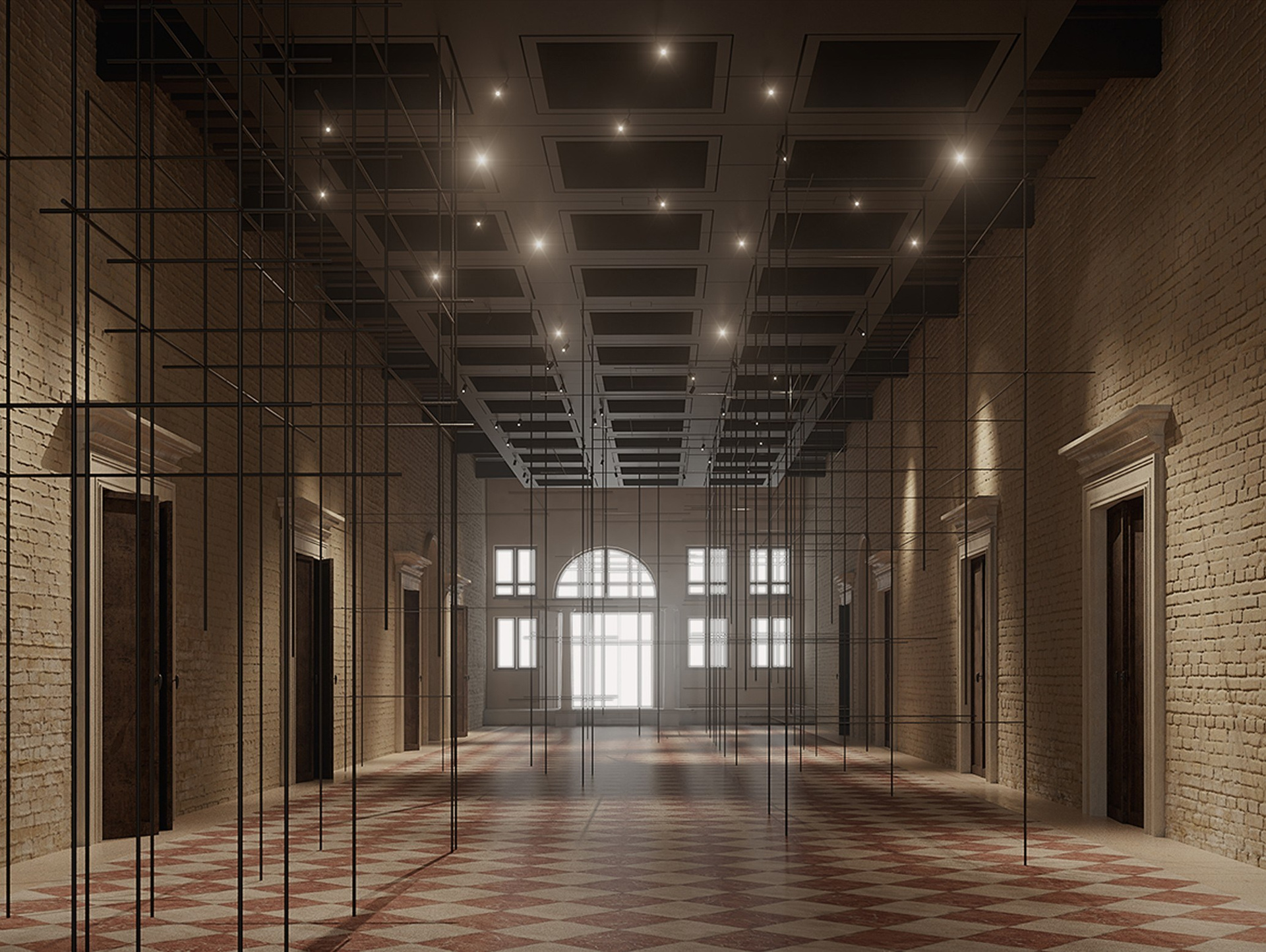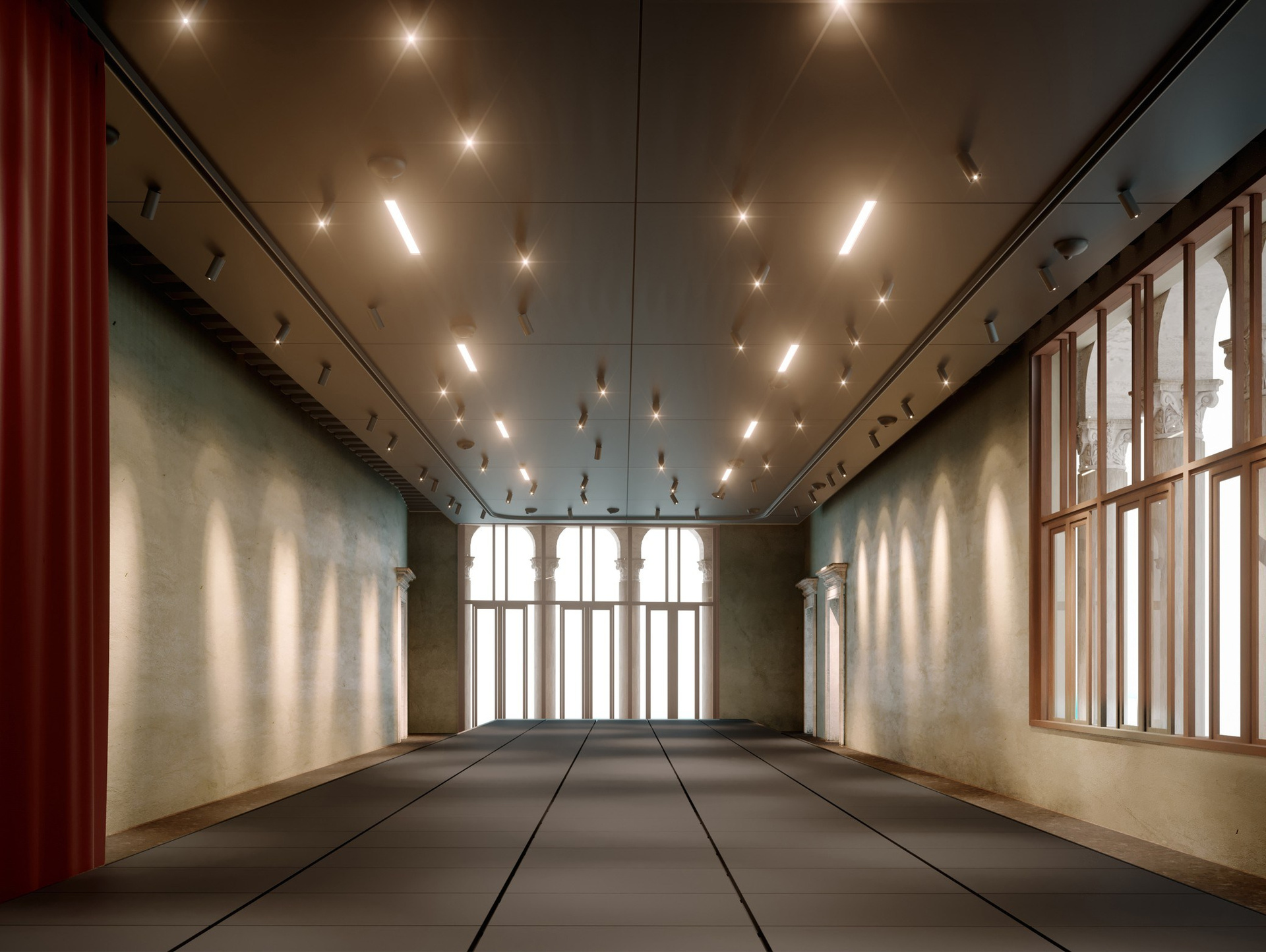 Мы обеспечиваем не только миграцию функций внутри здания, но и 10 вмешательств. Среди них есть несколько, которые можно считать внешними. Например: КАНАЛ БОЛЬШОЙ ПИЕР, ПИРС РИО — КАТРОН и САДОВЫЙ ПАВИЛЬОН. Но есть и внутренние. В здании есть центральное пространство, мы называем его ядром Ка’Трона. На каждом этаже мы идентифицируем это пространство PORTEGO и деликатно вводим в него новые элементы. Эти элементы представляют собой технические платформы, в состав которых входят такие инженерные системы, как: гибкая система световых пятен, система воздушного охлаждения или обогрева (за счет этого отсутствуют видимые отопительные приборы), системы трансформации пространства (стеклянные складные двери, раздвижные шторы, движущиеся выставочные бары). Эти платформы в основном представляют собой структурные сетки на потолке, прикрепленные к потолочным балкам 1979 года. На цокольном этаже SOTTO PORTEGO EXHIBITION находится ВЫСТАВОЧНАЯ ПЛАТФОРМА. На первом этаже CEREMONIAL PORTEGO находится СТЕКЛЯННАЯ АНФИЛАДНАЯ ПЛАТФОРМА с высокими складными стеклянными дверями; закрыв их, можно разделить пространство на 3 части. На втором этаже находится ТЕАТРАЛЬНАЯ ПЛАТФОРМА с раздвижным занавесом и опускающимися ширмами разного размера. Существует также съемный трансформируемый пол, который не повреждает существующий пол палаццо.
