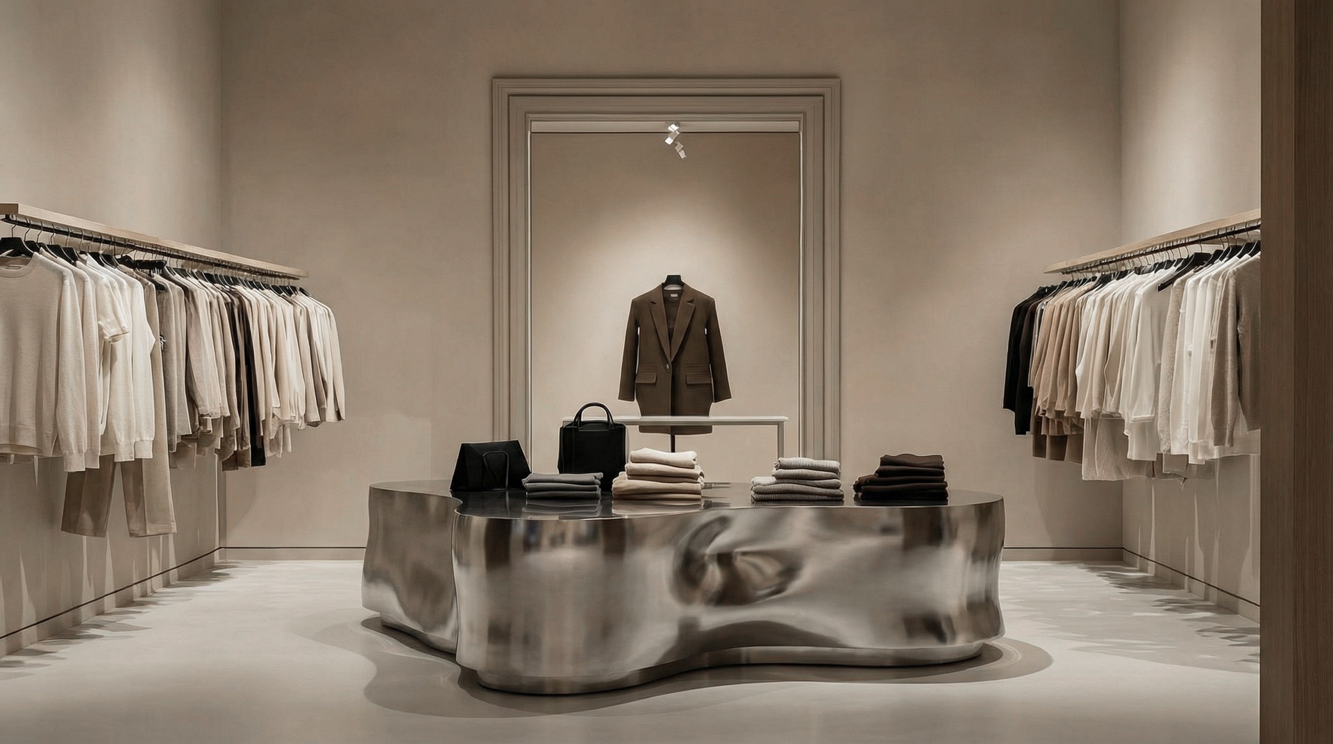 Островная стойка — центральный акцент торгового зала. Имеет параметрическую форму, вдохновлённую природными контурами: изгибами рек и волнообразными линиями. Плавные градиентные переходы и асимметричные контуры создают ощущение текучести, сохраняя функциональность. Конструкция интегрируется в напольное покрытие, создавая эффект парения; дополнена LED‑подсветкой по контуру. Стойка зонирует пространство, демонстрирует товары и привлекает внимание посетителей. Дизайн острова объединяет технологии и природу: сталь передаёт органичные формы, сочетая прочность с лёгкостью, а игра света на поверхности придаёт динамику интерьеру. Решение предназначено для бутиков и магазинов премиум‑класса, где важны уникальность и статусность объекта.
