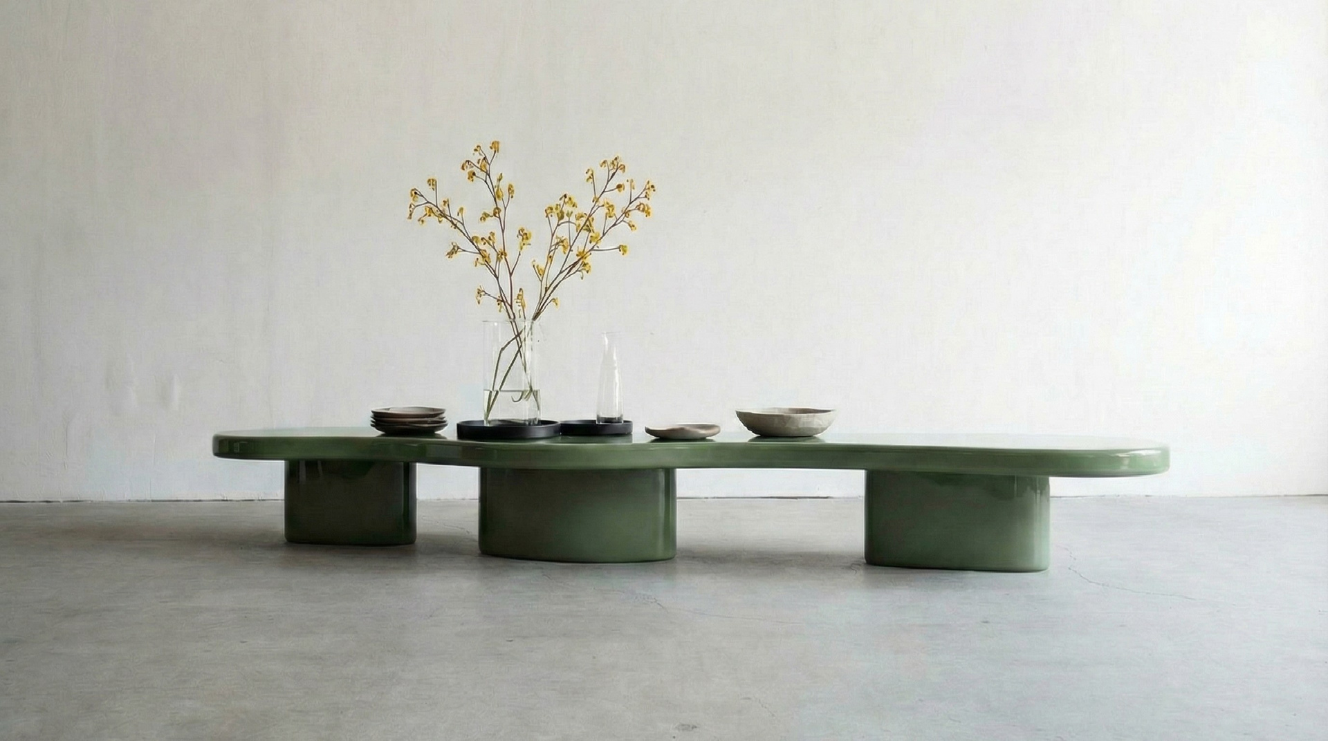 Многофункциональный стол с параметрической формой, вдохновлённой природными контурами. Его плавные, перетекающие линии создают ощущение динамики и обеспечивают эргономичность. Оливково‑зелёный цвет отсылает к оттенкам листвы и гармонично вписывается в разные интерьеры — от домашних до общественных. Конструкция может быть выполнена из ламинированного МДФ, натурального камня или композитных панелей; опционально — со встроенной подсветкой или нишами для кабелей. Решение для тех, кто ценит синтез природы и современного дизайна, сочетая функциональность с эстетикой природной гаммы.